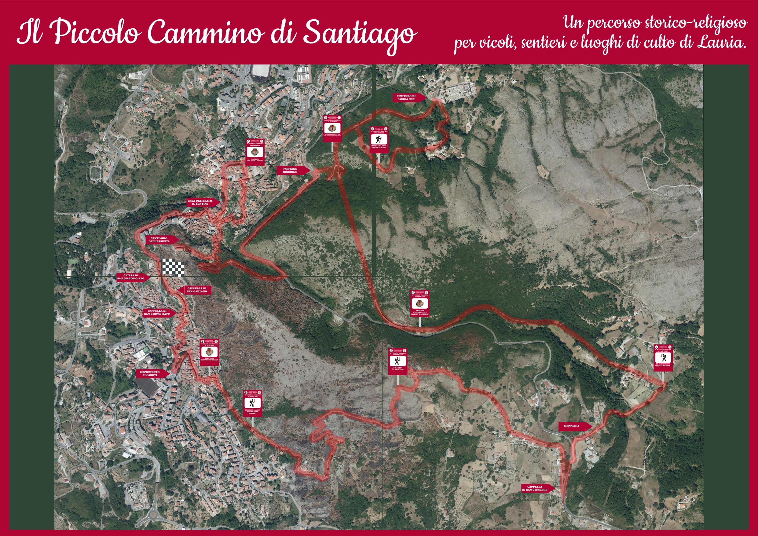Itinerario storico-religioso che si snoda tra i vicoli e i sentieri più antichi e caratteristici di Lauria e che di anno in anno attrae sempre più presenze tra pellegrini e appassionati di trekking, anche di paesi e regioni limitrofe, per una crescita e conoscenza anche mediatica che ha suscitato interesse tra illustri uomini di cultura e personalità universitarie. Il percorso ha una lunghezza complessiva di 13 Km circa con un intervallo di quota che va dai 380m ai 687m s.l.m. Non presenta alcuna difficoltà ed è perciò adatto a tutti. Si parte da Piazza San Giacomo e si prosegue lungo il tragitto segnalato da apposita cartellonistica. Come per il cammino spagnolo dalla tipica freccia gialla, sarà possibile visitare Chiese, Cappelle, monumenti, attraversare la ex ferrovia calabro-lucana oggi riqualificata e convertita in pista ciclabile e godere di panorami mozzafiato e natura incontaminata. Nello specifico si incontreranno la Cappella S. Gaetano e S. G. Battista, la Piazzetta dell’Ammiraglio, il Monumento ai caduti, il Monumento a San Giuseppe di Copertino e ancora la Chiesa di S. Maria dei Suffragi, la Cappella di S. Veneranda, i resti della Chiesa Santa Maria della Sanità, l’Edicola della Madonna del Carmine, le Cappelle di Sant’Elia (posto in cui inoltre è possibile ammirare un bellissimo panorama) e S. Giuseppe, la Croce di Ferro (la nostra Cruz de Fer), la Cappella della Divina Pastora, la Cappella di San Ferdinando, la Chiesa Madre di San Nicola di Bari oggi Santuario Diocesano Beato Domenico Lentini, la Casa del Beato Domenico Lentini, la Cappella di San Pasquale, il Castello Ruggero, il Santuario della Madonna Assunta, la Cappella di Santa Veneranda, il Palazzo Municipale, per poi chiudere nella Chiesa Madre di San Giacomo Apostolo Maggiore.